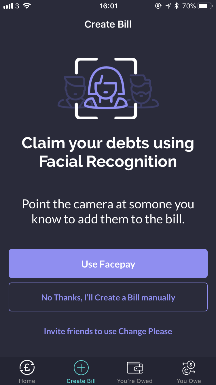 So you're out for dinner and you end up paying... again, you promise yourself that you'll remember, but you never do. ChangePlease! has got your back. Open the app, scan your group of friends with your camera and create a debt with the relevant people in seconds.