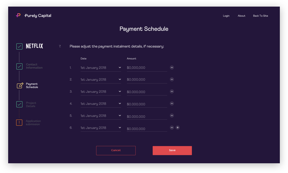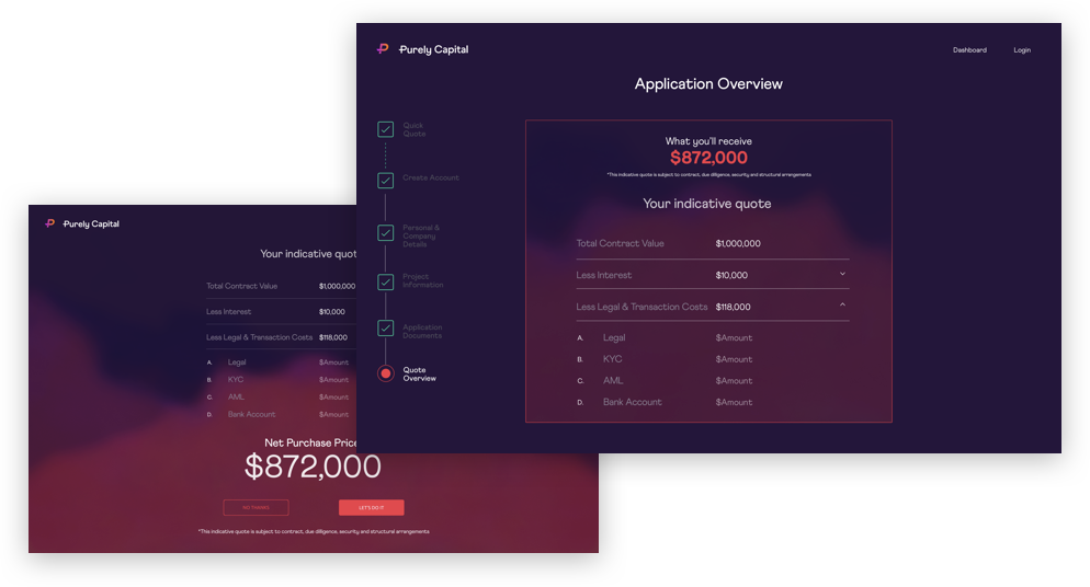 To create an engaging, interactive experience to what is a considerably sterile subject matter. Large forms are always daunting for users and product designers so creating a unique and exciting initial experience was paramount for 'selling' this product to new visitors.